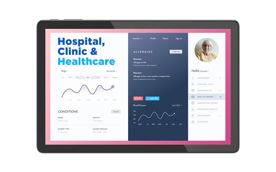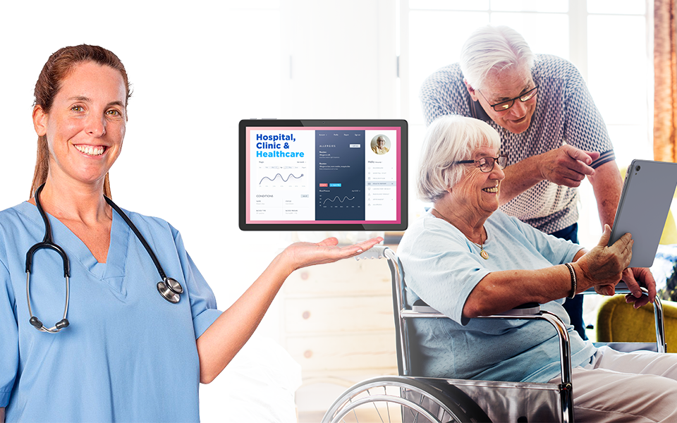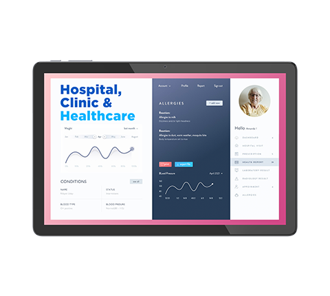 The tablet serves as the central hub for collecting health data, either through its connectivity (Wi-Fi/4G) to wearable sensors or through manual input. We customize the system firmware to support secure, background data transmission protocols compliant with healthcare standards, allowing continuous and reliable sharing of patient health status with remote nursing staff.