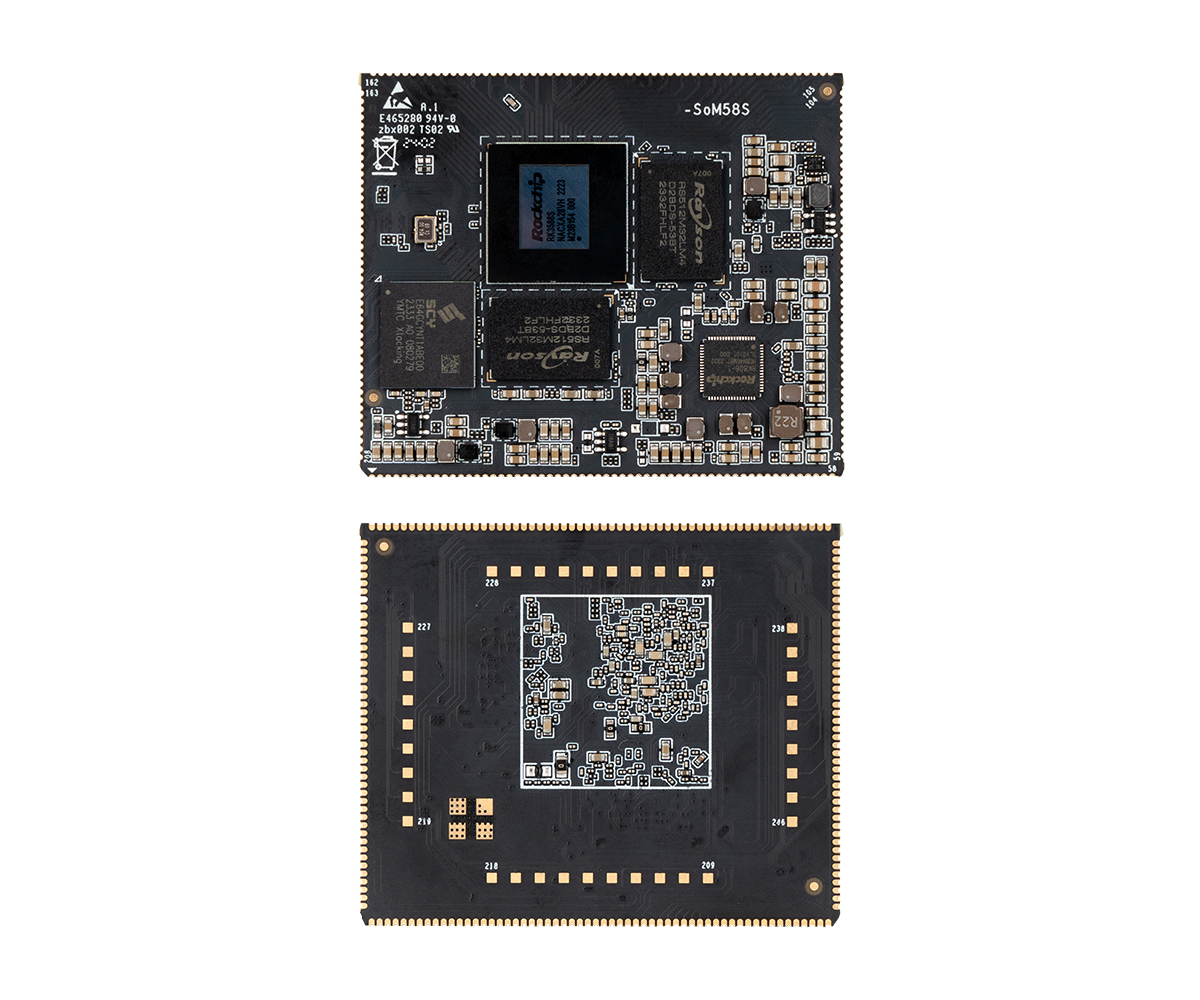RK3588 SOM featuring an 8nm process, 4x Cortex-A76 + 4x Cortex-A55 CPUs, Mali-G610 GPU, and a 6.0TOPS NPU. Designed with a stamp hole interface for flexible integration, it's perfect for AI, multimedia, and automotive applications.