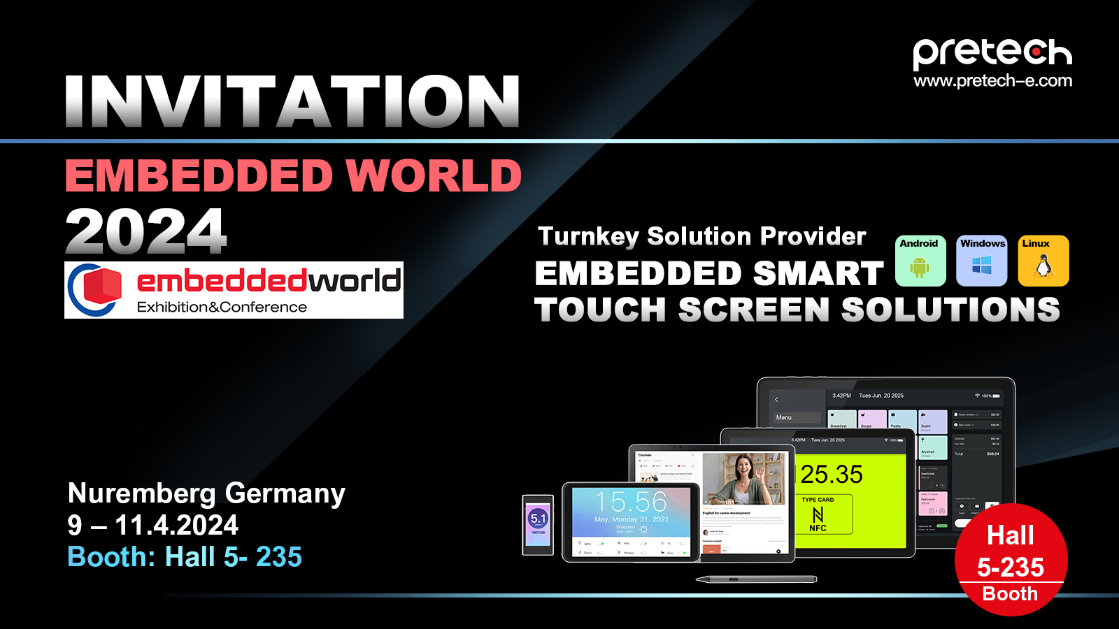 We are thrilled to extend our invitation to you for the upcoming Embedded World 2024, taking place in Nuremberg, Germany, from April 9th to 11th. As a leading provider of customized embedded hardware solutions catering to various industries, Pretech is excited to showcase our latest innovations and services at Booth No. Hall 5-235.