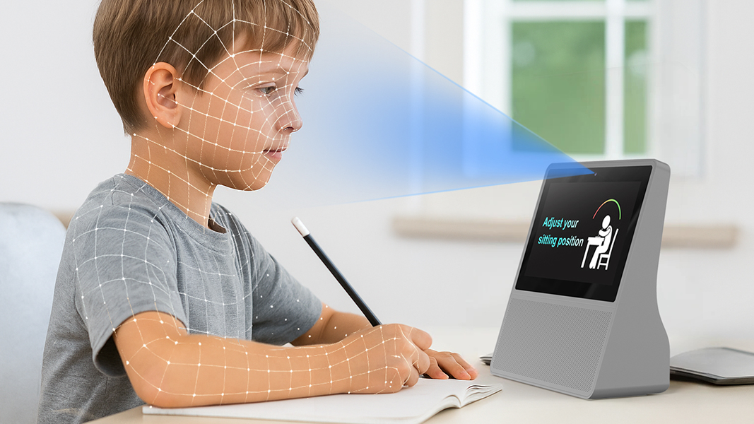 The device integrates a TOF camera to monitor the child's sitting position in real-time by sensing 3D depth and distance. We customize the camera drivers and the application's AI algorithm (CPU with AI Power / APU) to provide real-time feedback and alerts when the child's posture deviates, ensuring they maintain the proper ergonomic position for healthy learning.
