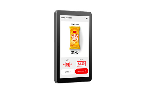 Pretech smart panel display designed for vending machine solutions. It operates on Android OS, featuring a MT8768 processor, ensuring robust performance. With no internal battery and NFC for payment, LTE connectivity, POE, RS485, and multiple ports including USB and GPIO for versatile use in vending environments.