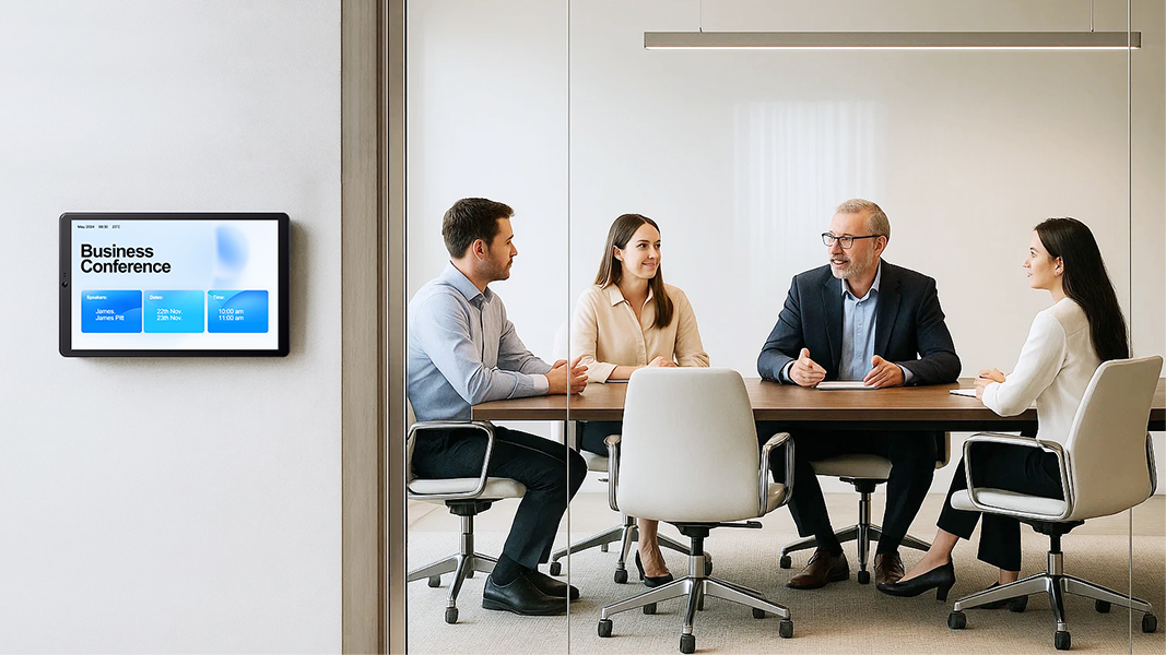 The tablet's radar continuously monitors the conference room. It wakes the screen when someone enters and enters sleep mode after 60 seconds of inactivity.