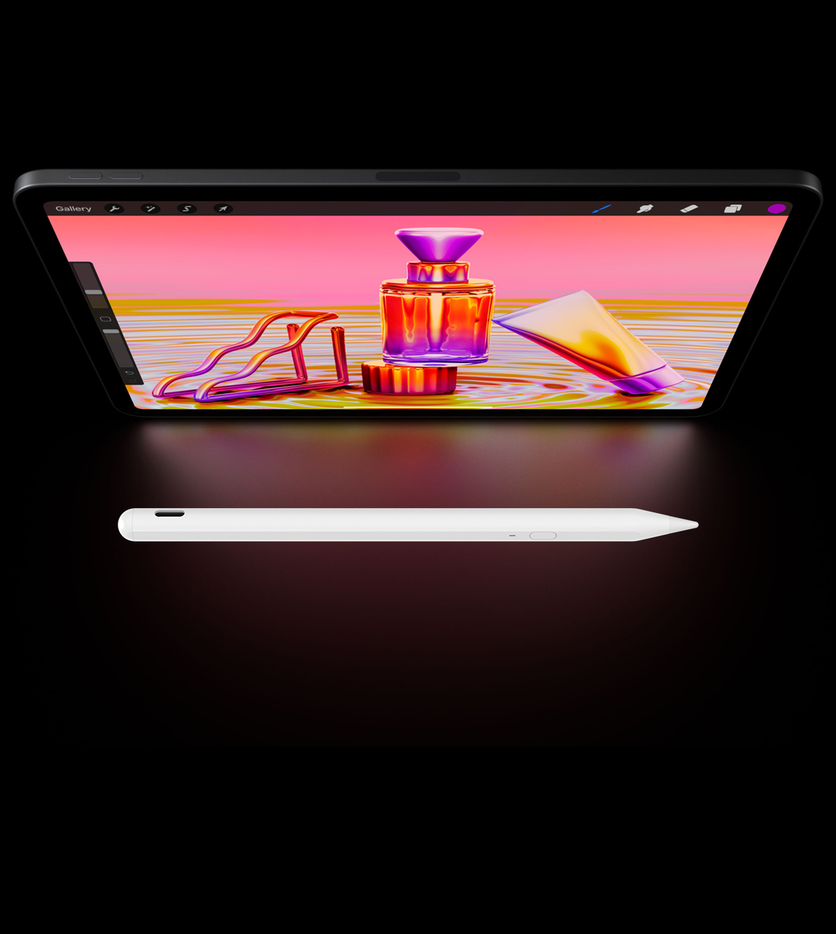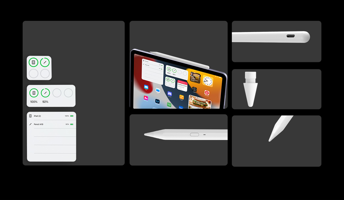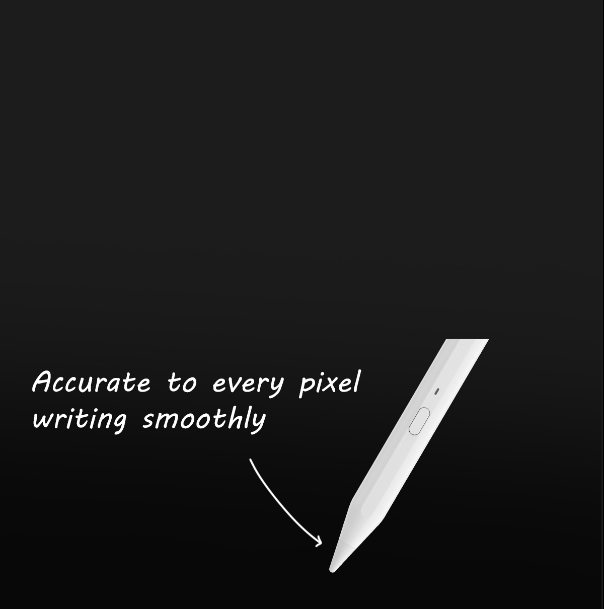 The pencil battery status (0-100%) can be displayed on the iPad. | Attaches Magnetically Pencil Battery Status Display Multi-functions of Press Key | Type C Fasting Charing Replaceable tip Tilt and Pressure Sensitivity |