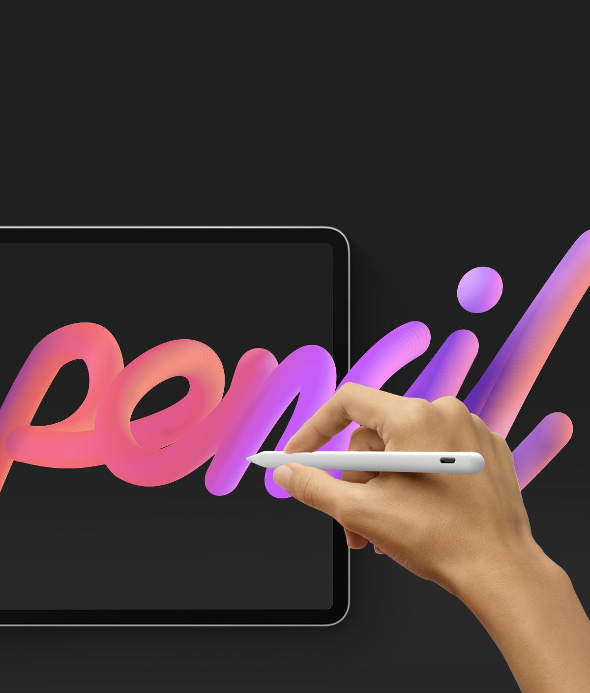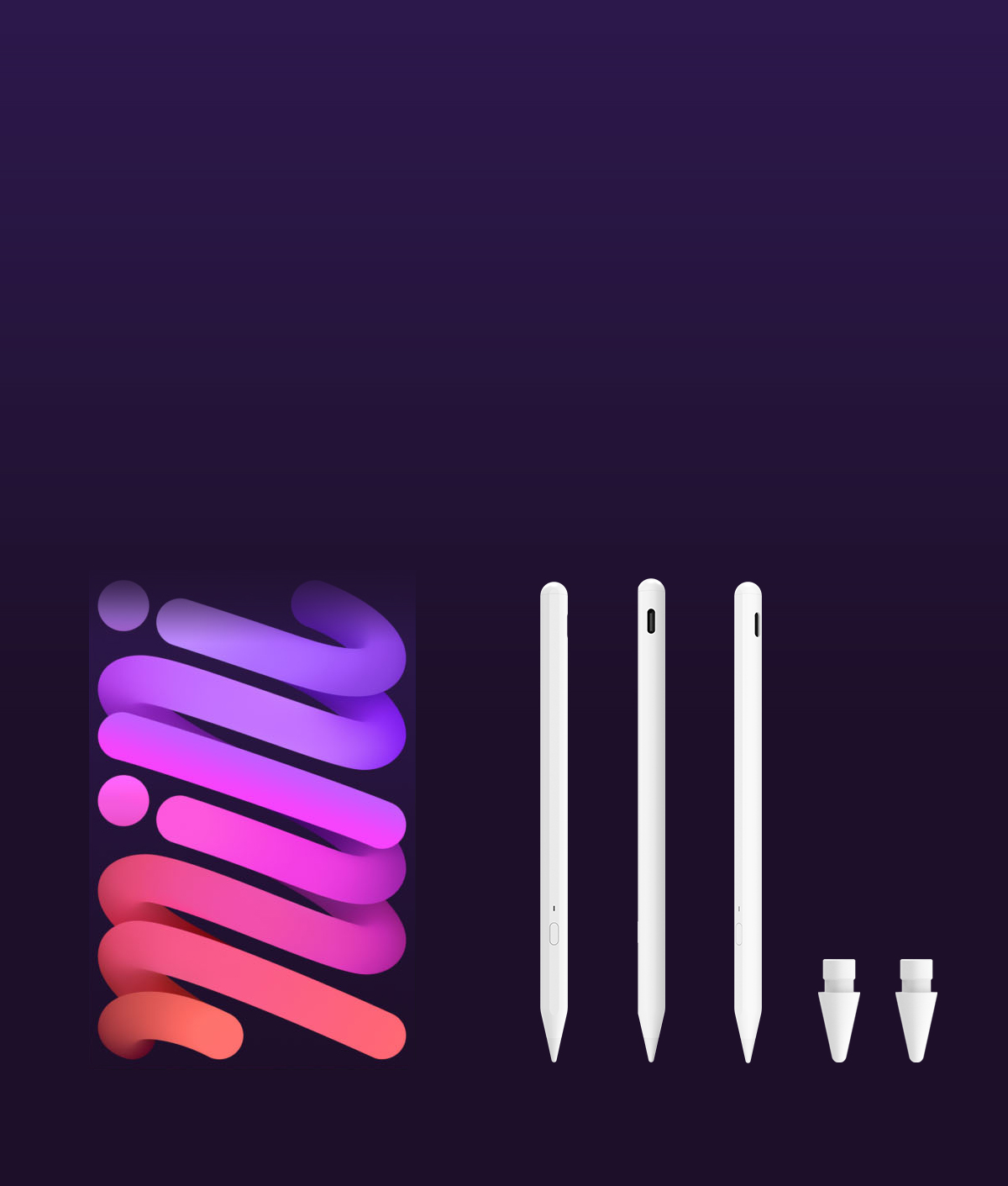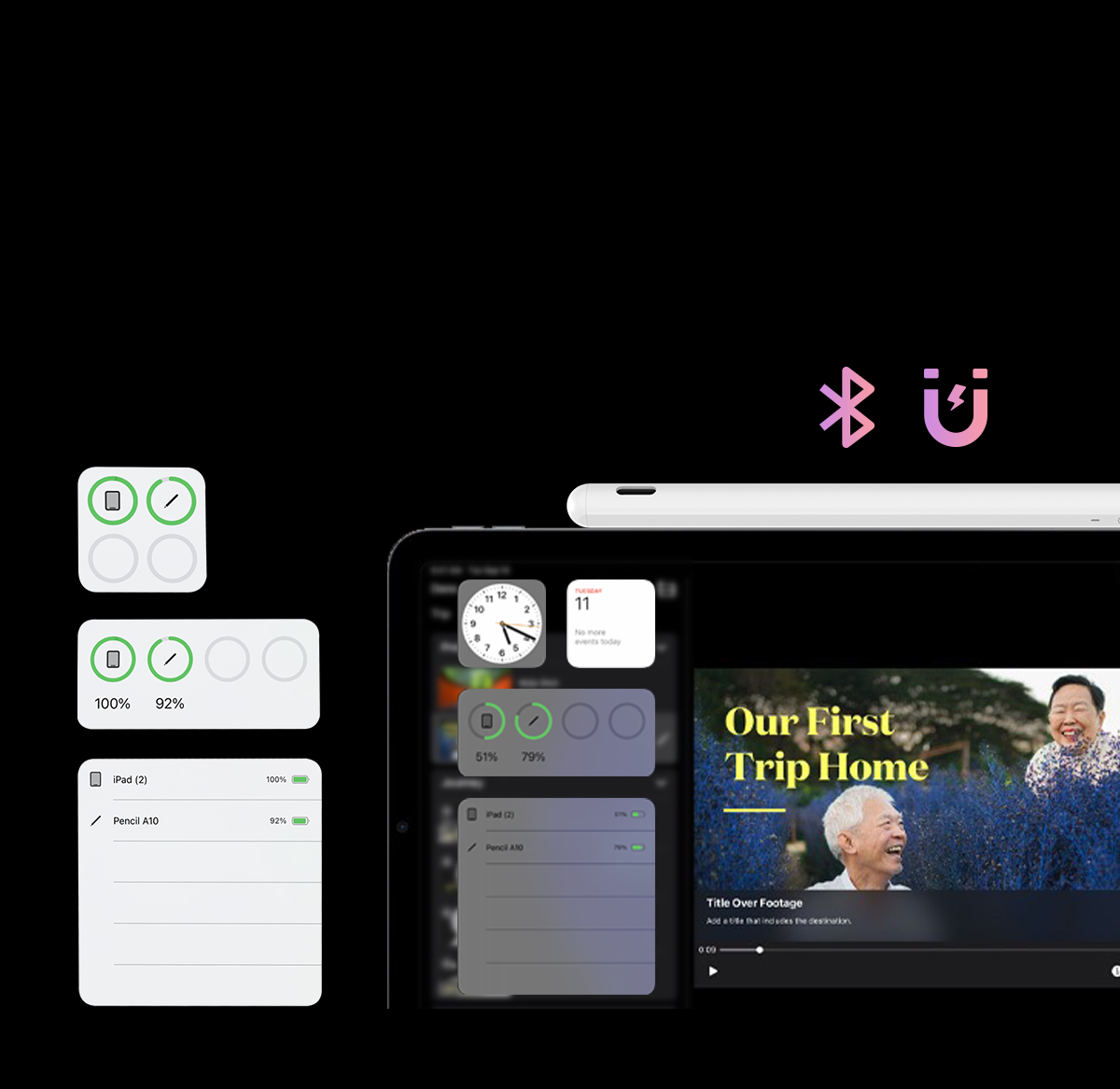 The pencil battery status (0-100%) can be displayed on the iPad. | Attaches Magnetically Pencil Battery Status Display Multi-functions of Press Key | Type C Fasting Charing Replaceable tip Tilt and Pressure Sensitivity |